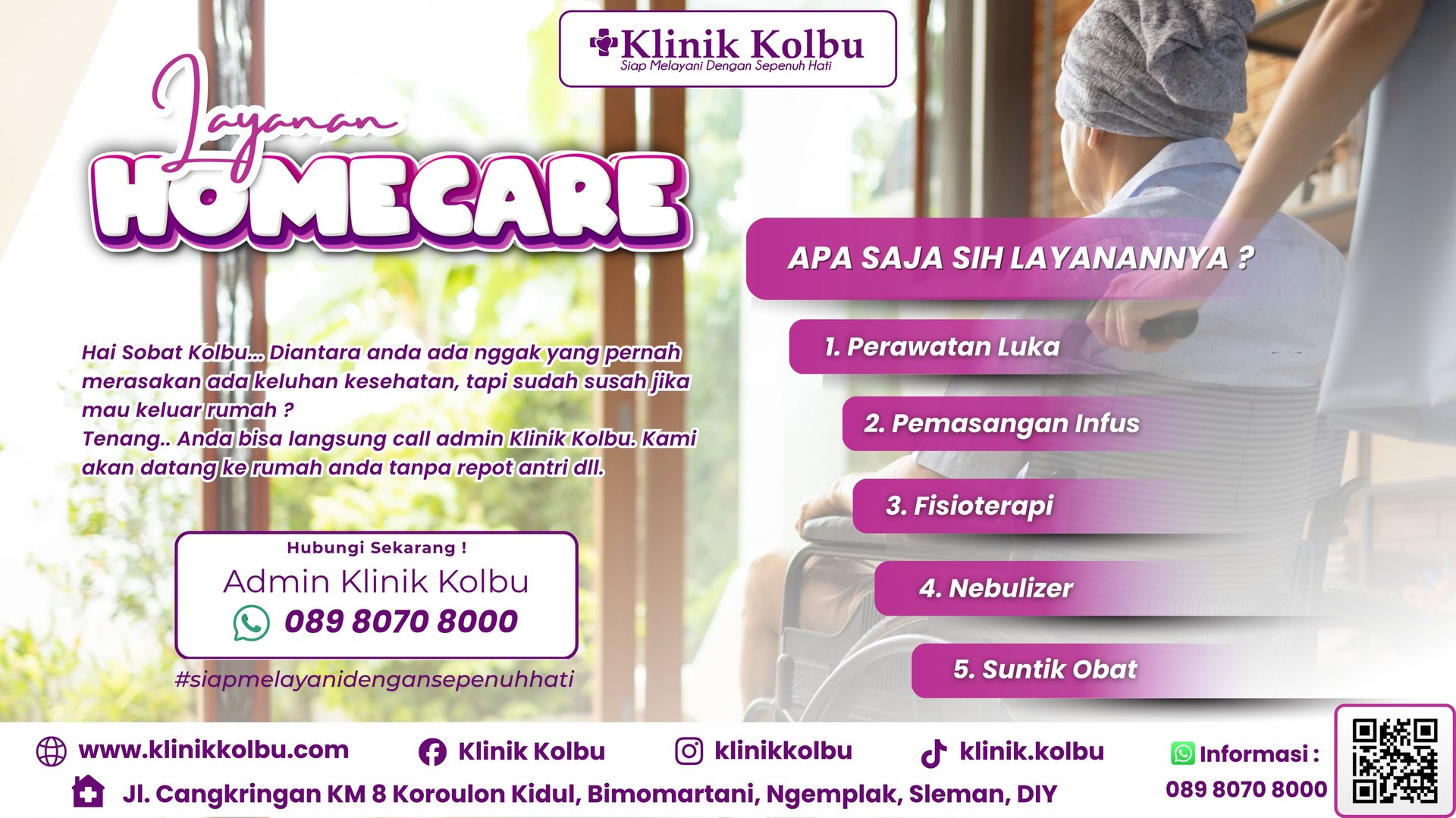 Kami adalah klinik berpengalaman 20 tahun yang fokus pada fisioterapi, perawatan lansia, homecare, rawat jalan, sunat modern, dan penjualan alat bantu kesehatan.